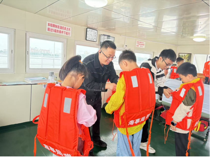 活動伊始,安全監(jiān)督設(shè)備部副部長吳少波通過現(xiàn)場演示救生衣穿戴、安全標(biāo)識解讀、趣味問答等形式,生動地向親子家庭系統(tǒng)講解水上交通知識。孩子們踴躍分享乘船經(jīng)歷、參與互動問答,在歡聲笑語中掌握防溺水技巧與應(yīng)急避險技能,現(xiàn)場實操救生設(shè)備使用率達(dá)100%。